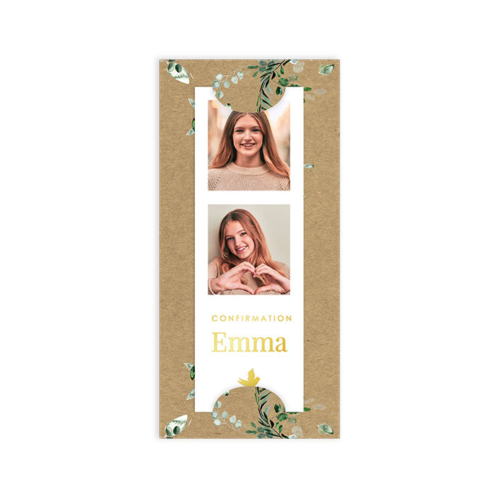 Faire-part de confirmation avec bande photo, branches et dorures