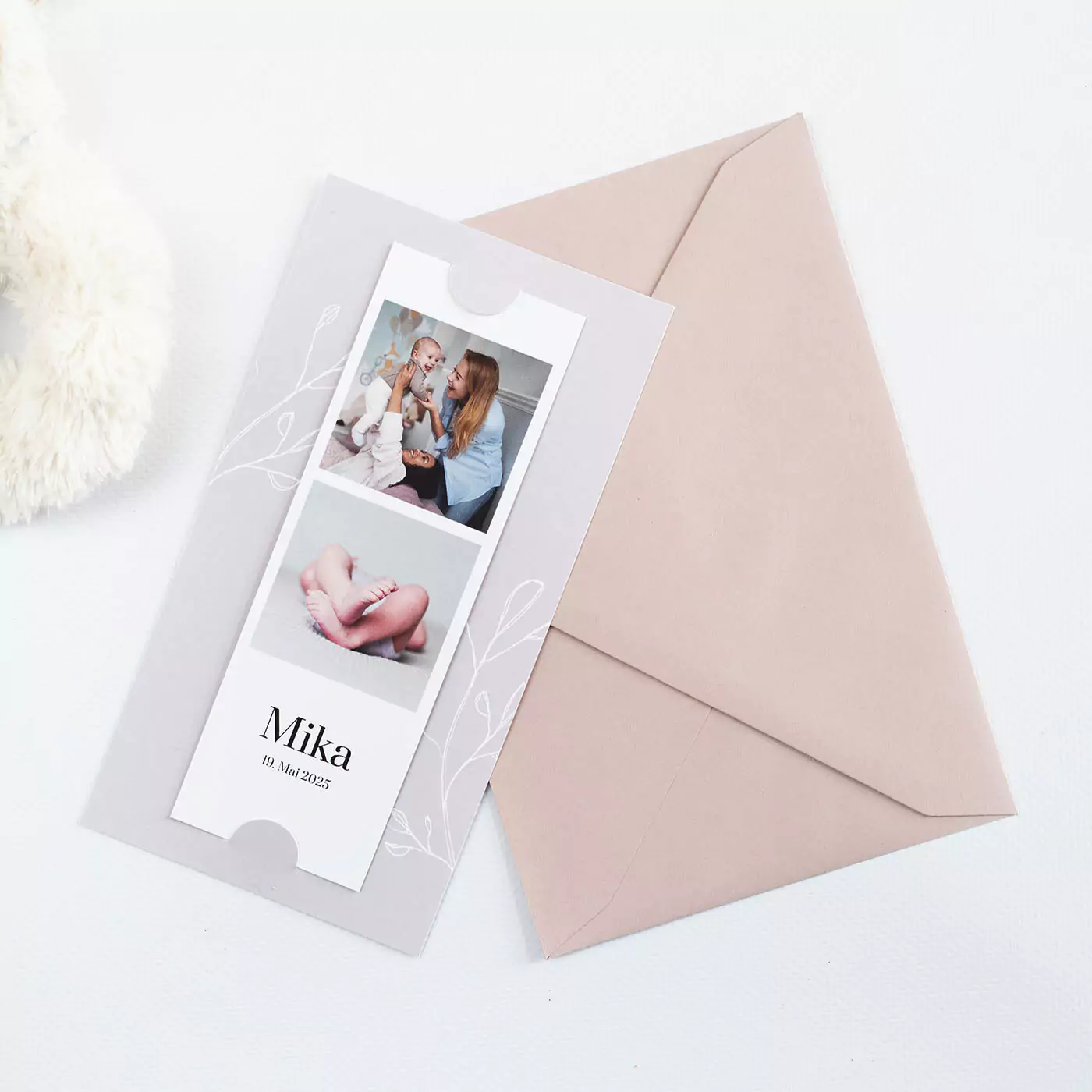 Faire-part de naissance avec bande de photos et petites branches