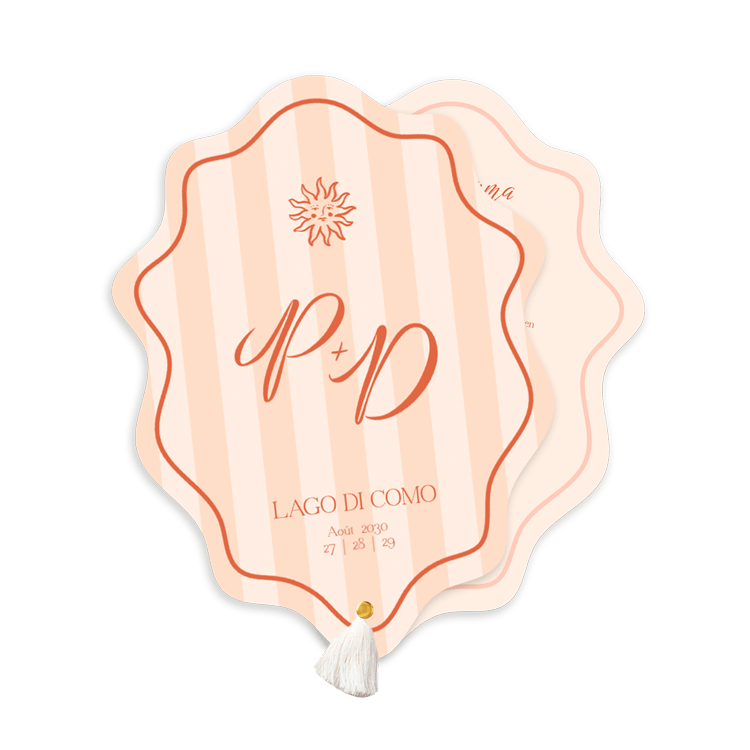 Ce faire-part de mariage en rayures se compose de deux cartes à assembler, par exemple à l’aide d’une pampille et d'attache parisienne.