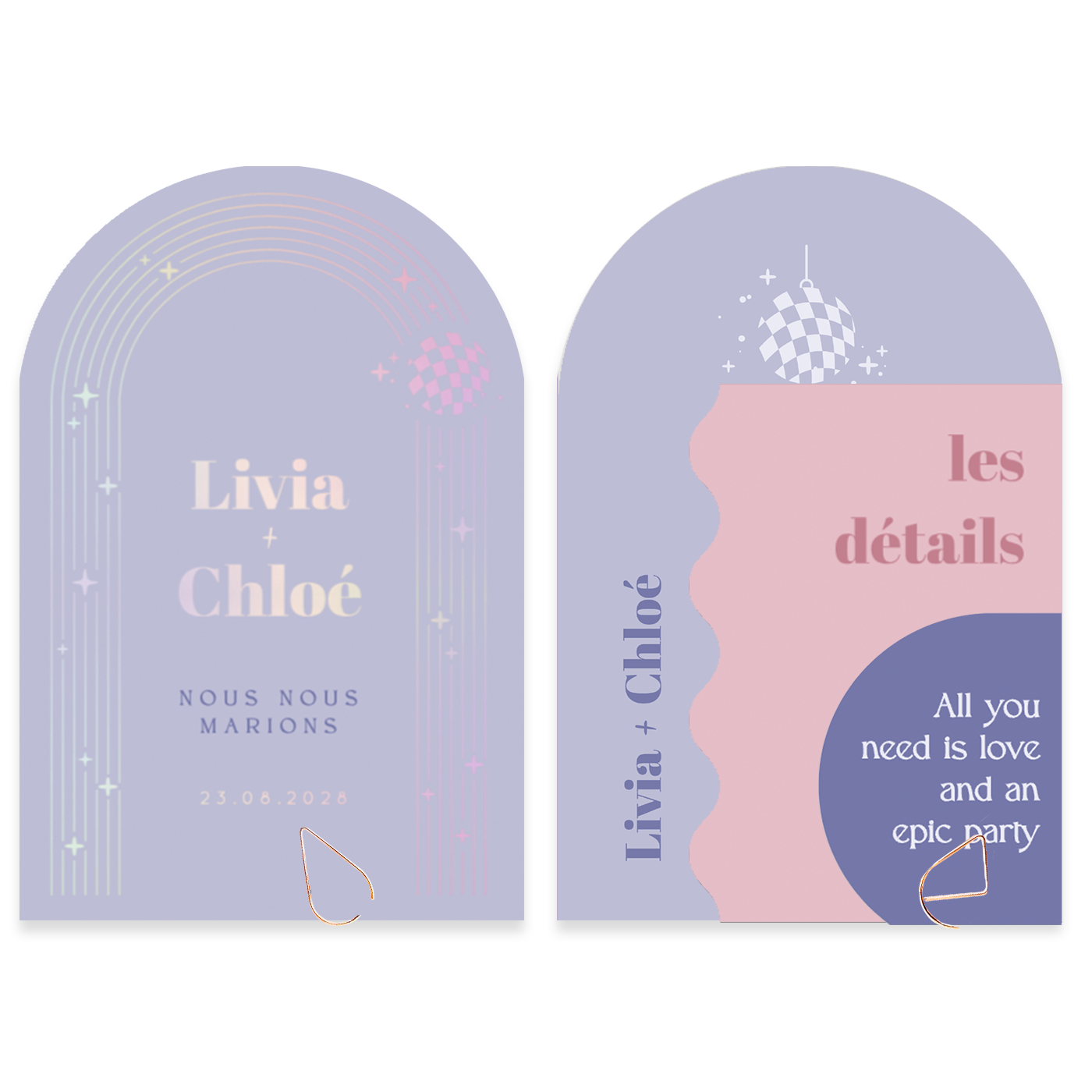 Faire-part de mariage original avec thème rétro en rose et violet