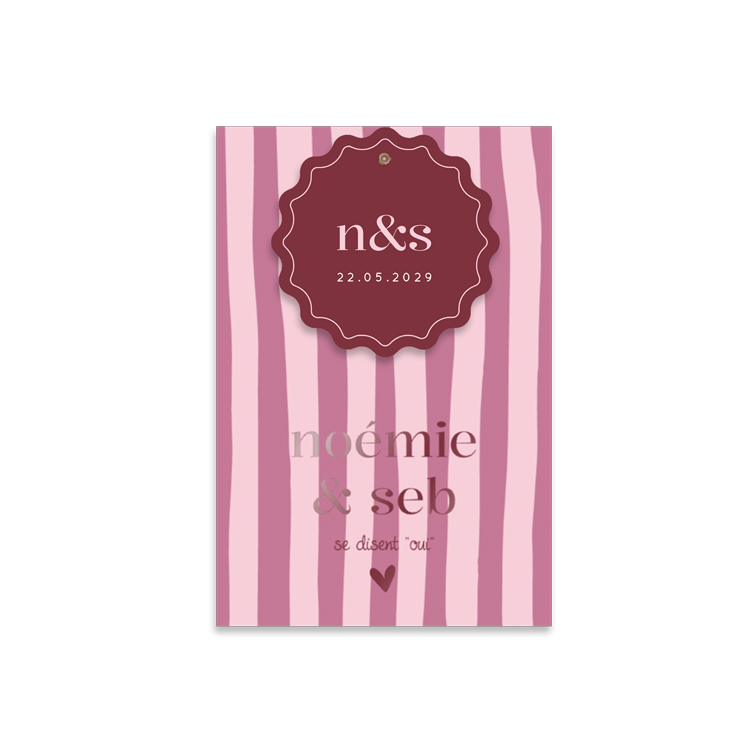 Ce faire-part de mariage, à la fois plein de douceur et de dynamisme, se distingue par ses rayures roses en color blocking et sa finition brillante sur les prénoms des tourtereaux.