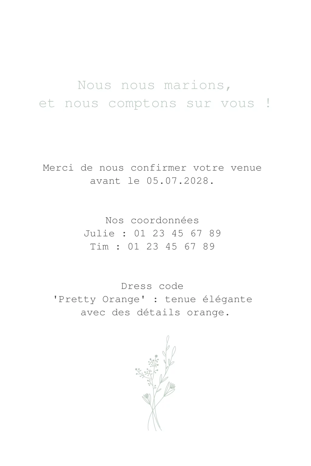 Note: Une feuille d'insertion est le complément parfait pour vos invitations de mariage. Sur ces fines feuilles, vous avez la possibilité d'ajouter des informations supplémentaires pour les invités. Nos feuilles d'insertion sont disponibles dans les types de papier suivants: papier transparent (200 g/m2), sans bois (papier sans bois blanc 170 g/m²) et papier Biotop (papier blanc cassé 195 g/m2). Le papier Biotop est légèrement jaunâtre, le papier sans bois est blanc. L'avantage du papier Biotop et du papier sans bois est que vous pouvez imprimer des deux côtés. Le papier transparent peut être imprimé d'un seul côté et a un aspect laiteux. Si vous voyez l'insert de votre choix mais que vous souhaitez l'avoir sur un autre type de papier, veuillez nous contacter et nous le convertirons. Notez que l'impression en feuille est uniquement possible sur du papier Biotop. Choisissez un insert de la même taille ou légèrement plus petit que votre carte de mariage.