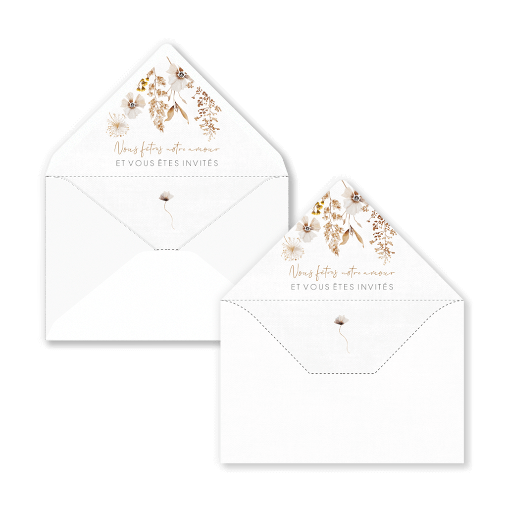 Sur demande, nous pouvons adapter ce design à un autre format ou créer une doublure assortie à votre faire-part de mariage.