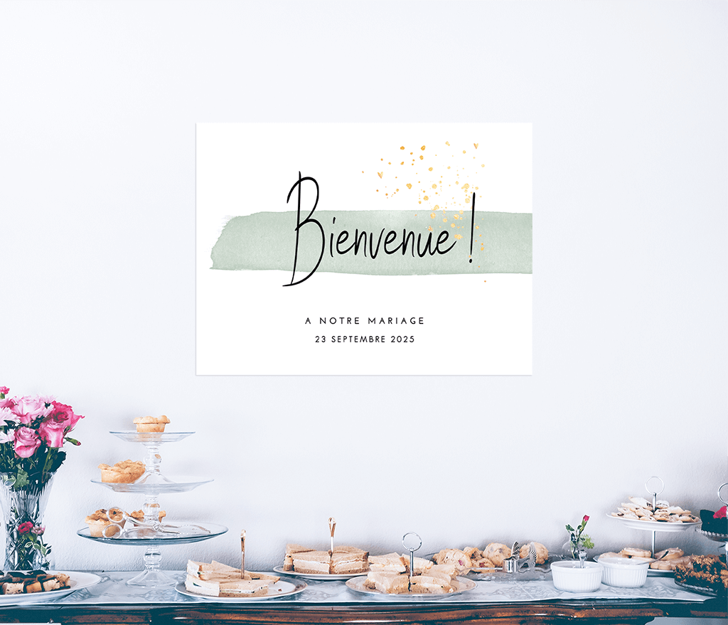 Affiche de bienvenue avec un trait à l'aquarelle et des détails dorés