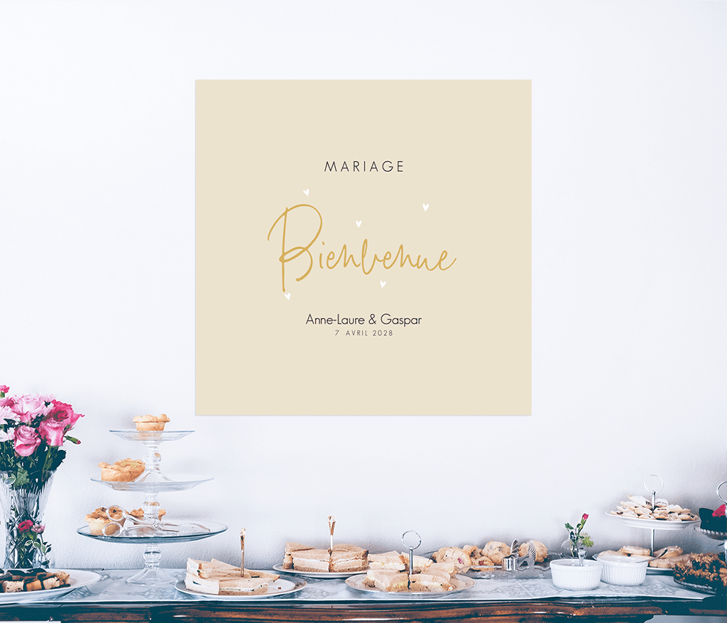 Affiche de bienvenue avec un fond sable et des cœurs blancs