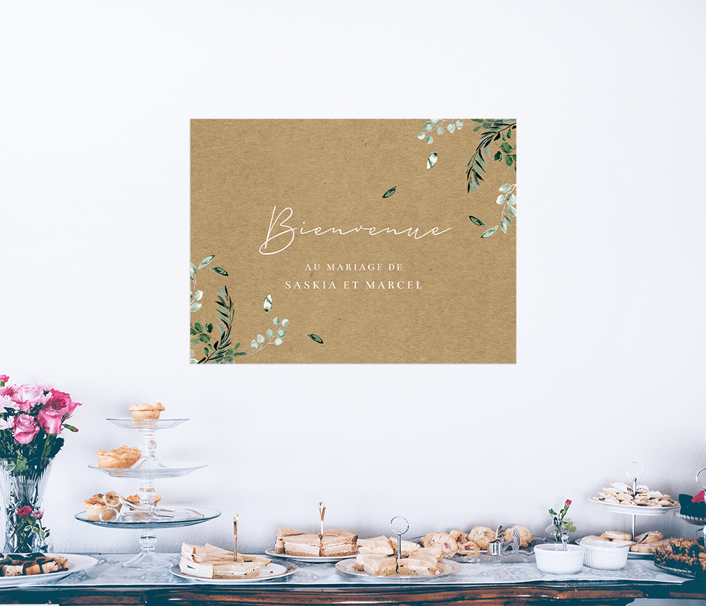 Affiche de bienvenue avec branches d'eucalyptus sur aspect kraft