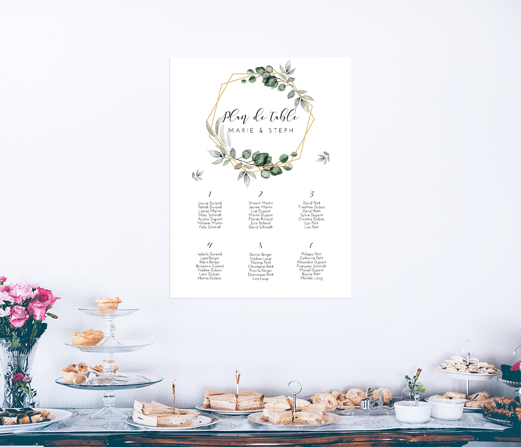 Affiche Plan de table avec feuilles d'eucalyptus et dorures