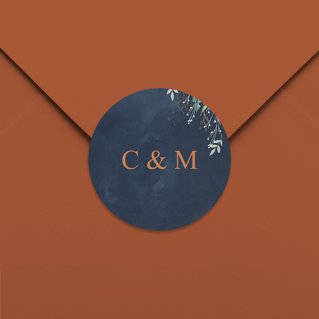 Autocollant bleu foncé avec des branches d'aquarelle et des initiales