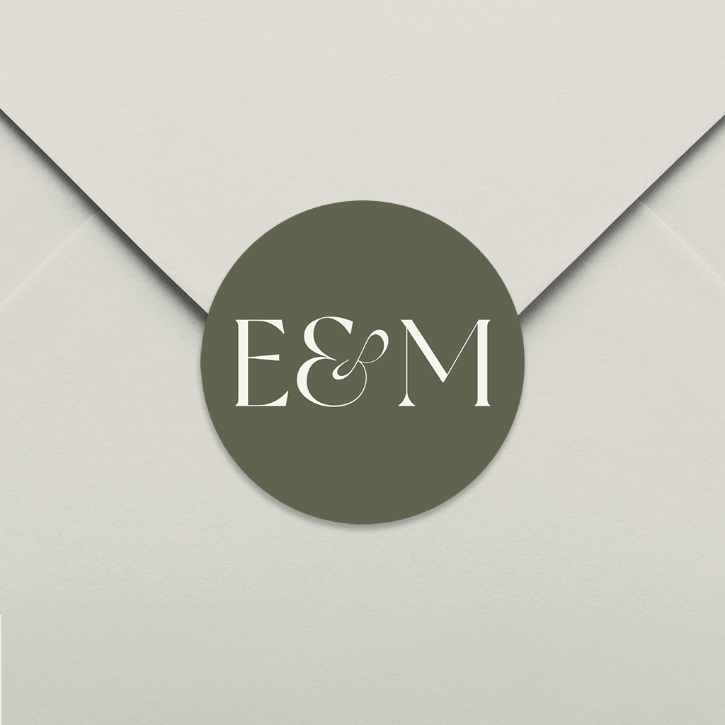 Autocollant avec fond vert olive et iniales des mariés - 25 pièces