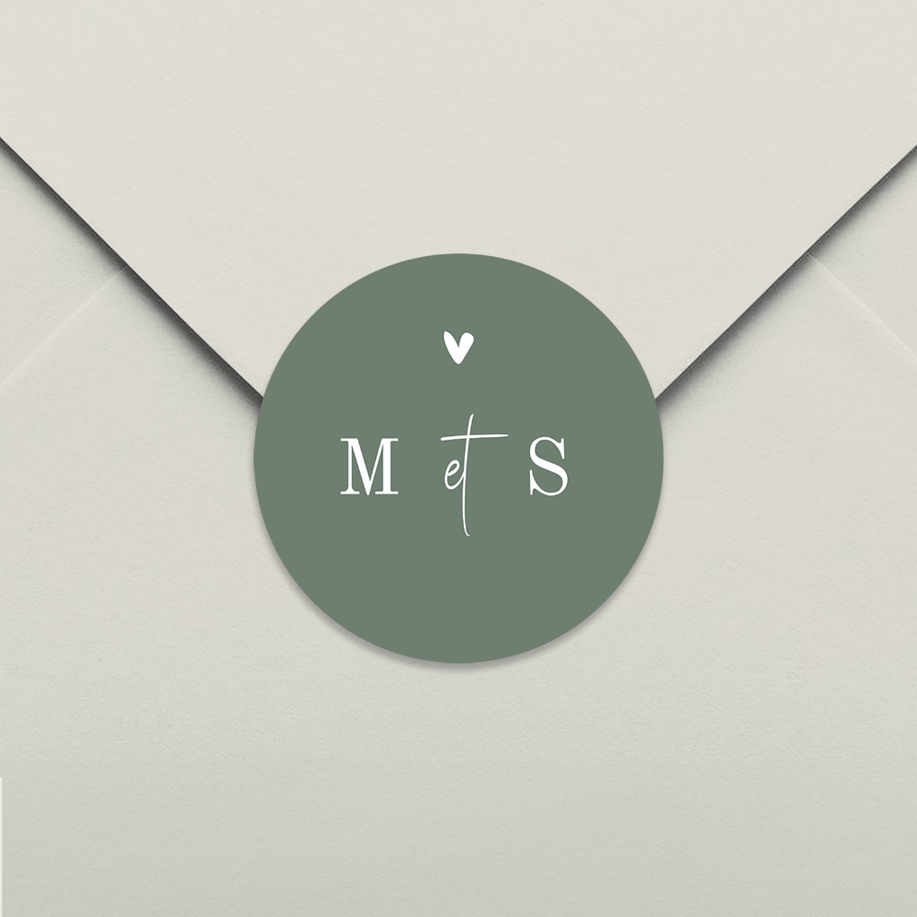 Autocollant rond avec initiales et cœur sur fond vert foncé 25 pièces