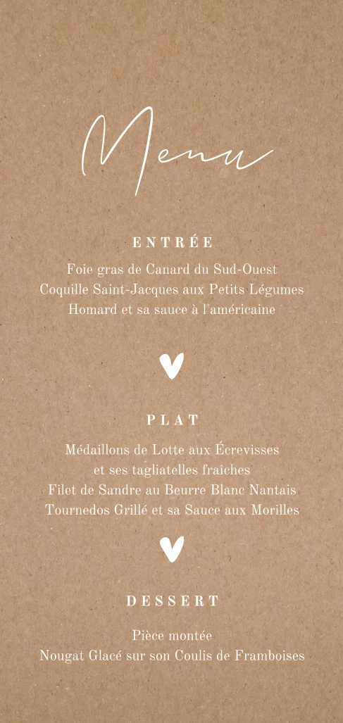Menu avec un fond style kraft et des cœurs blancs