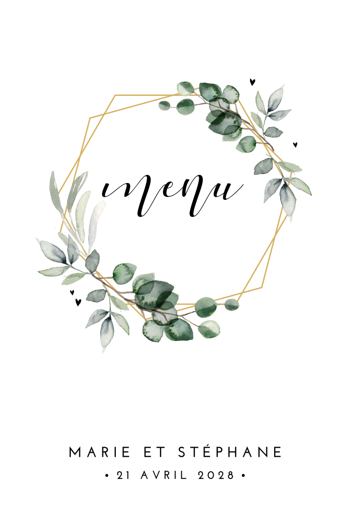 Menu avec hexagone doré et feuilles d'eucalyptus.