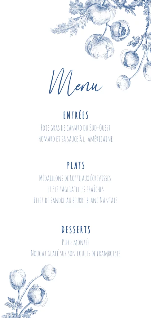 Carte de menu avec des fleurs bleues
