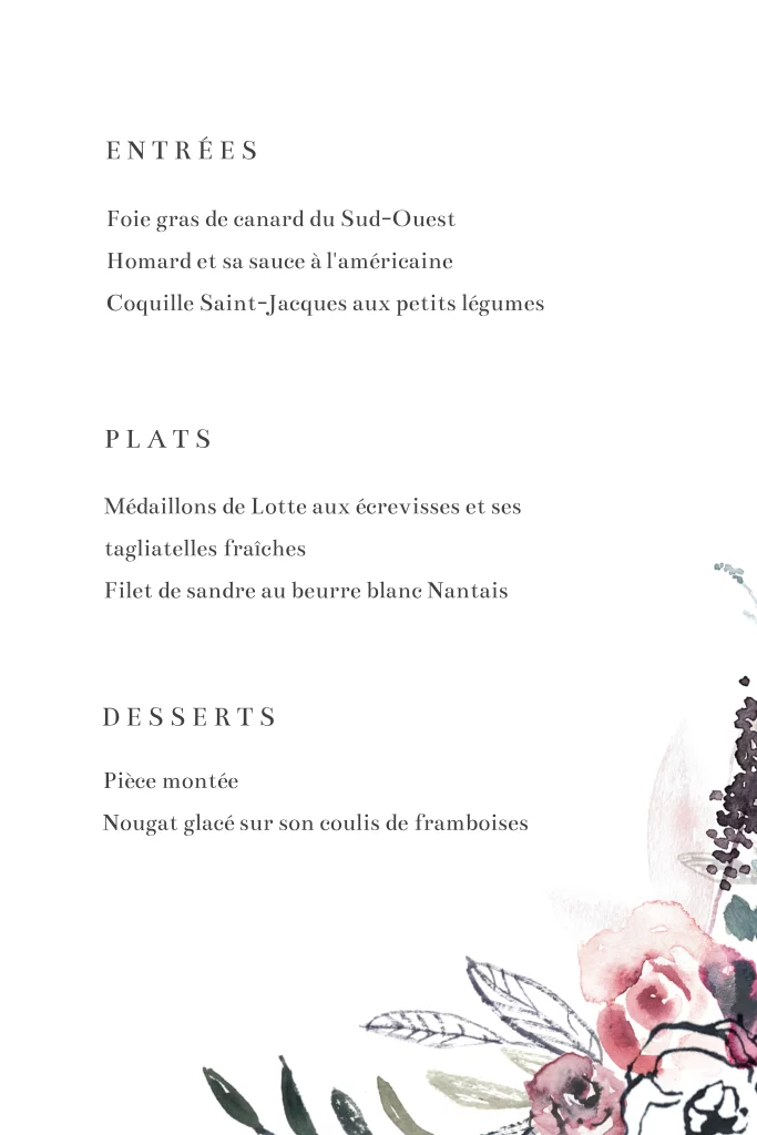 Menu dans des tons doux avec fleurs roses et feuilles blanches