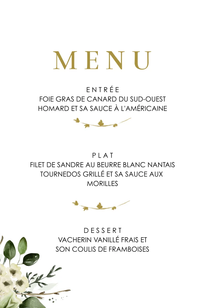 Carte de menu avec des fleurs romantiques et les initiates des mariés