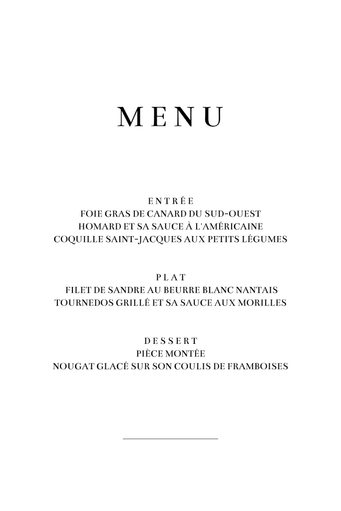 Carte de menu simple en noir et blanc, avec des coins arrondis.