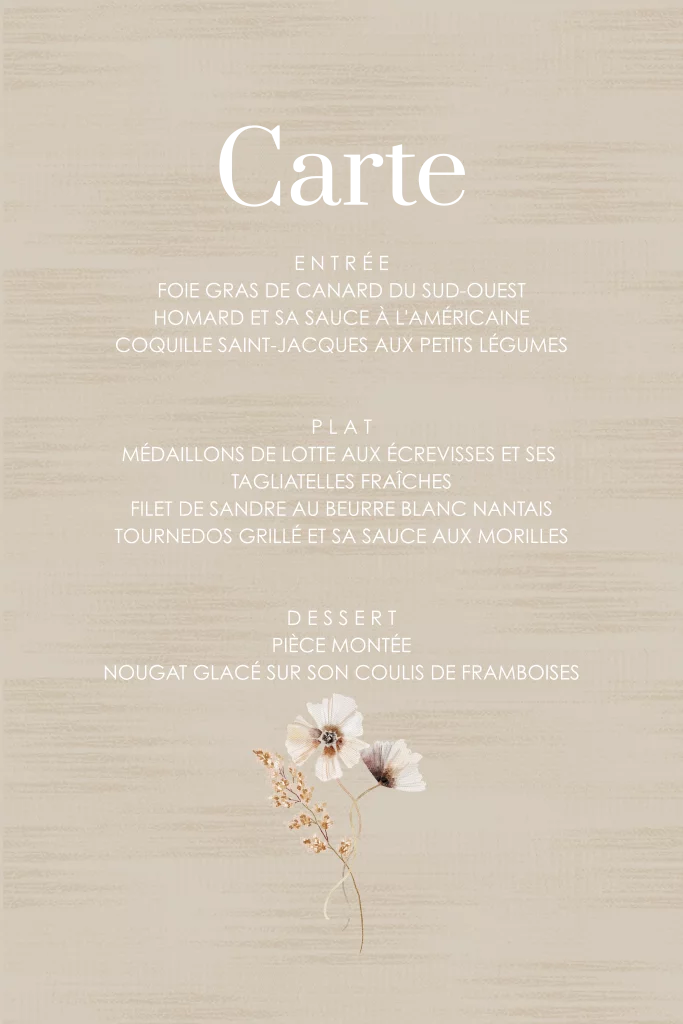 Menu avec détails dorés et fleur sur un fond aspect lin.