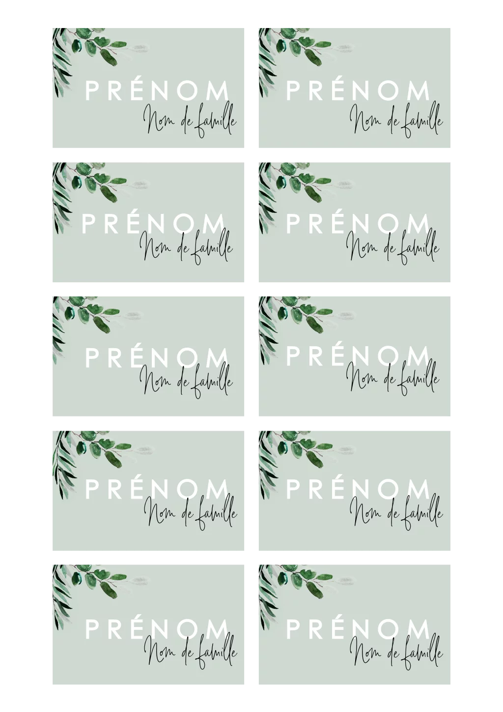 Marque-place avec feuilles d'eucalyptus sur fond vert