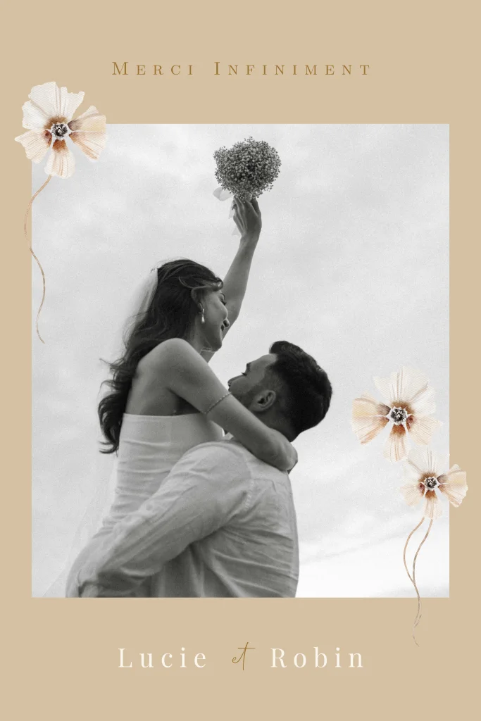 Carte de remerciement beige pour mariage avec photo, violettes et coins arrondis