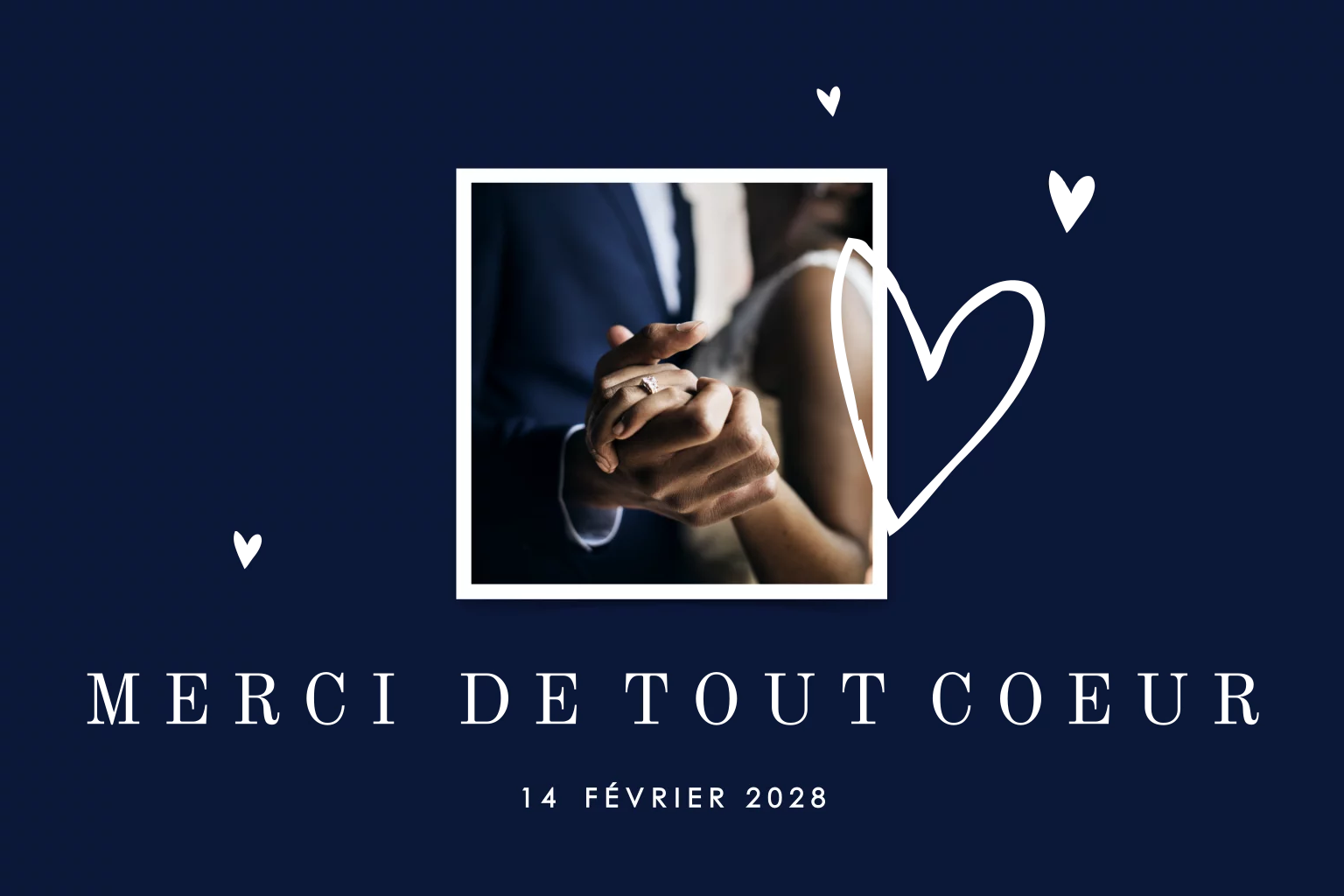 Belle carte de remerciement bleue avec finition en or rose et photo
