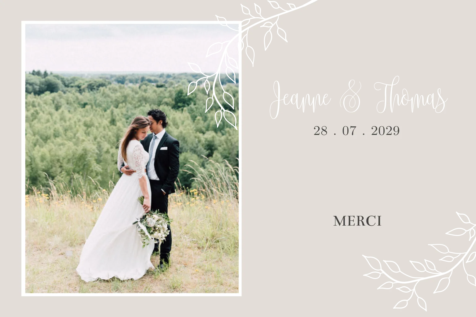 Carte de remerciement tendance avec photo et feuilles en or rosé