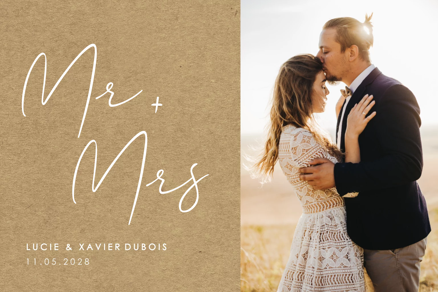 Carte de remerciement de mariage, aspect kraft avec photo et dorure.