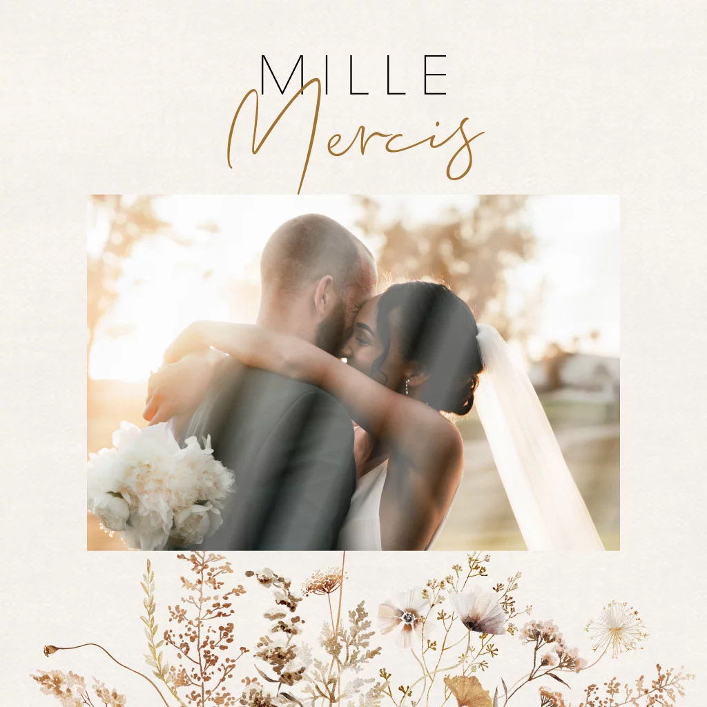 Carte de remerciement avec photo des mariés et fleurs des champs