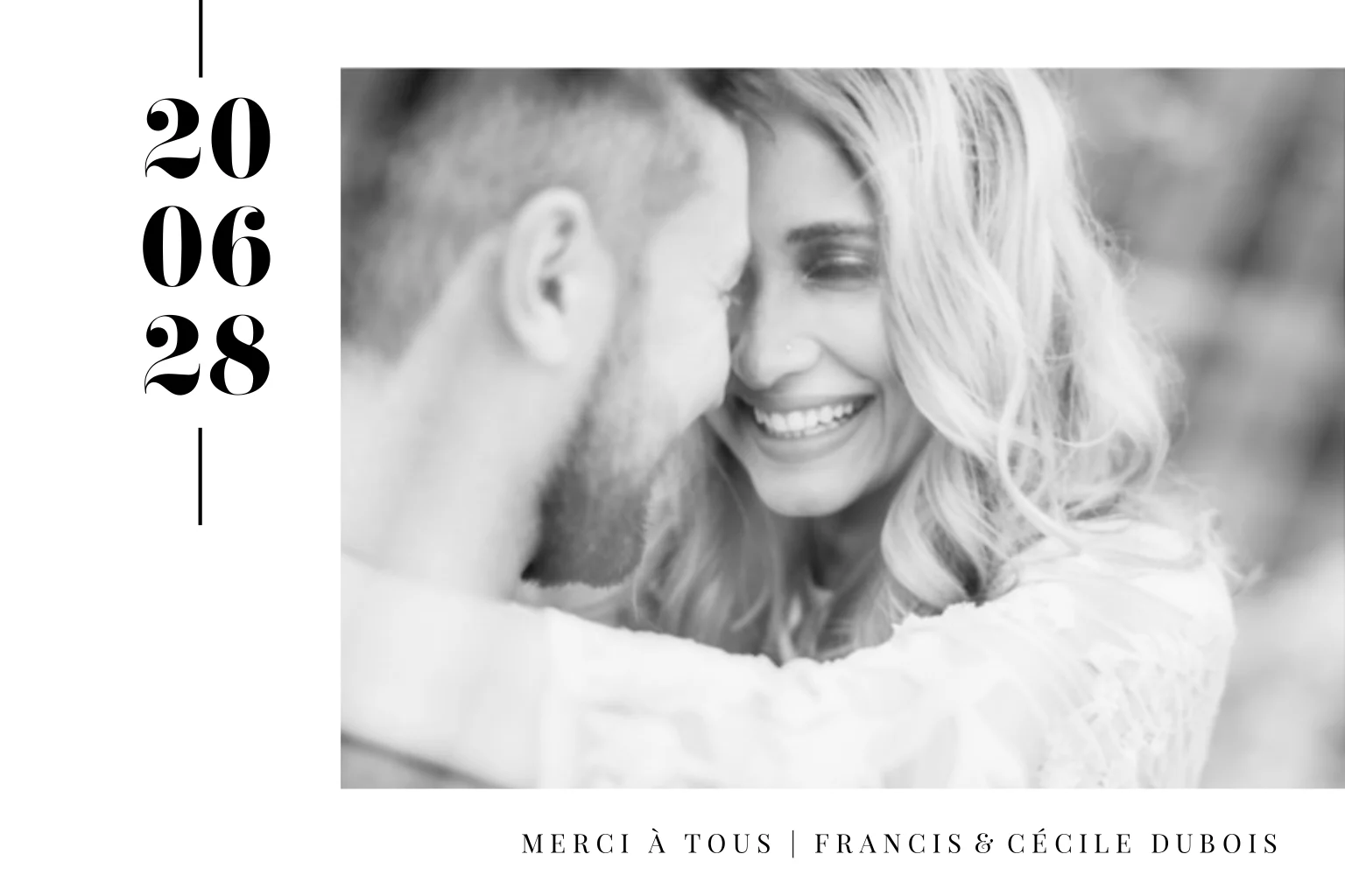 Les cartes de remerciement de mariage devraient être envoyées de préférence 2 à 8 semaines après le mariage. Vous aurez alors eu le temps de déballer tous les cadeaux et de remercier personnellement vos invités - en plus, vous pourrez personnaliser vos remerciements avec les plus belles photos de la cérémonie et de la réception.