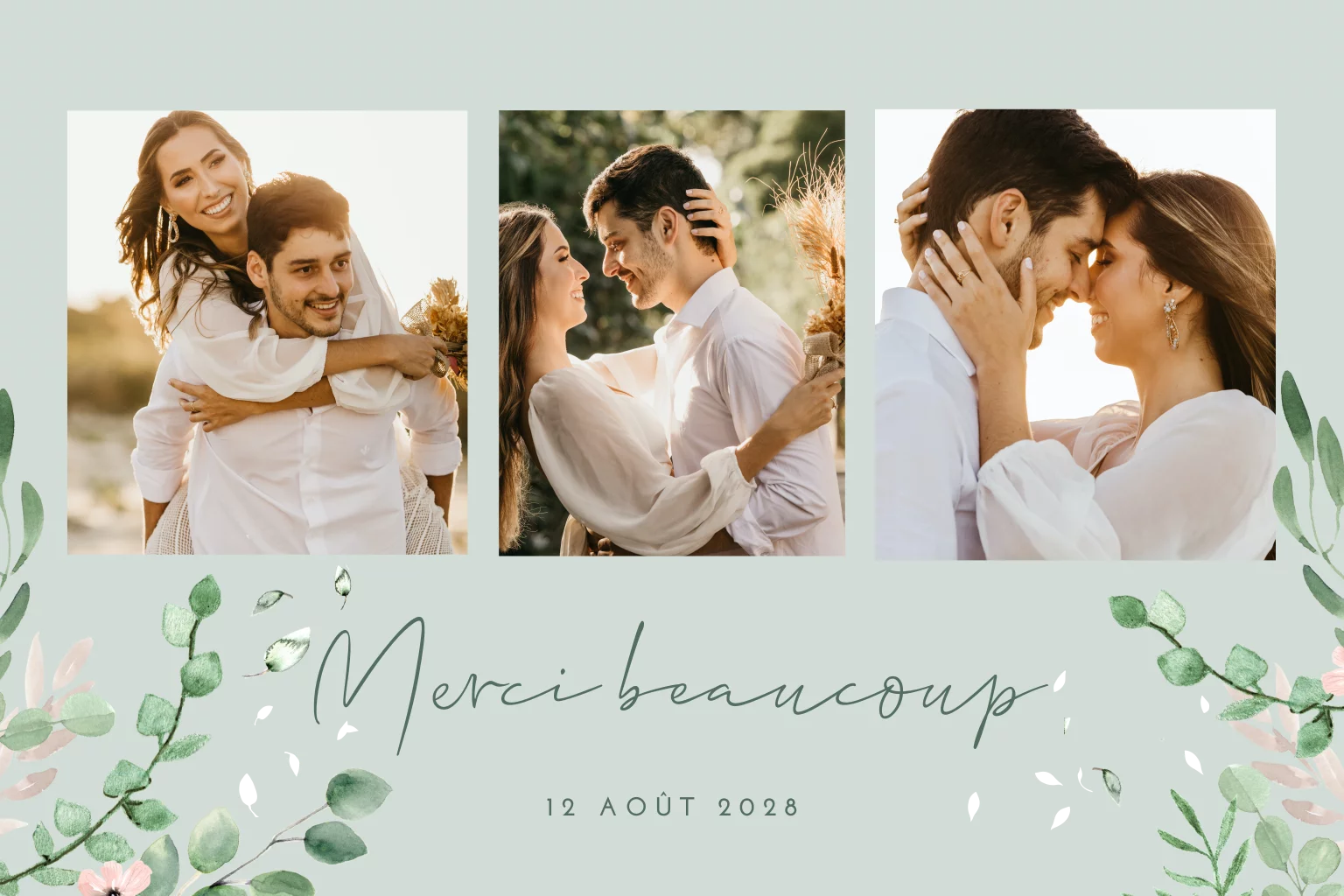 Carte de remerciement avec des branches vertes et des fleurs roses