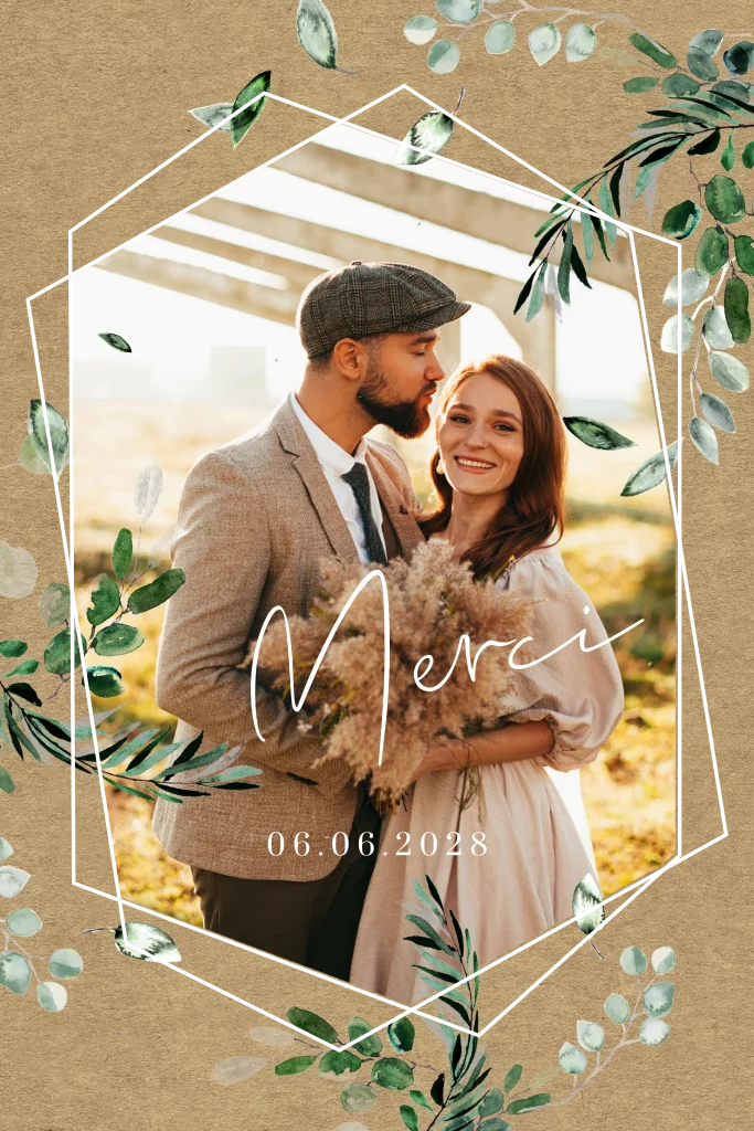 Carte de remerciement aspect kraft avec eucalyptus et détails dorés