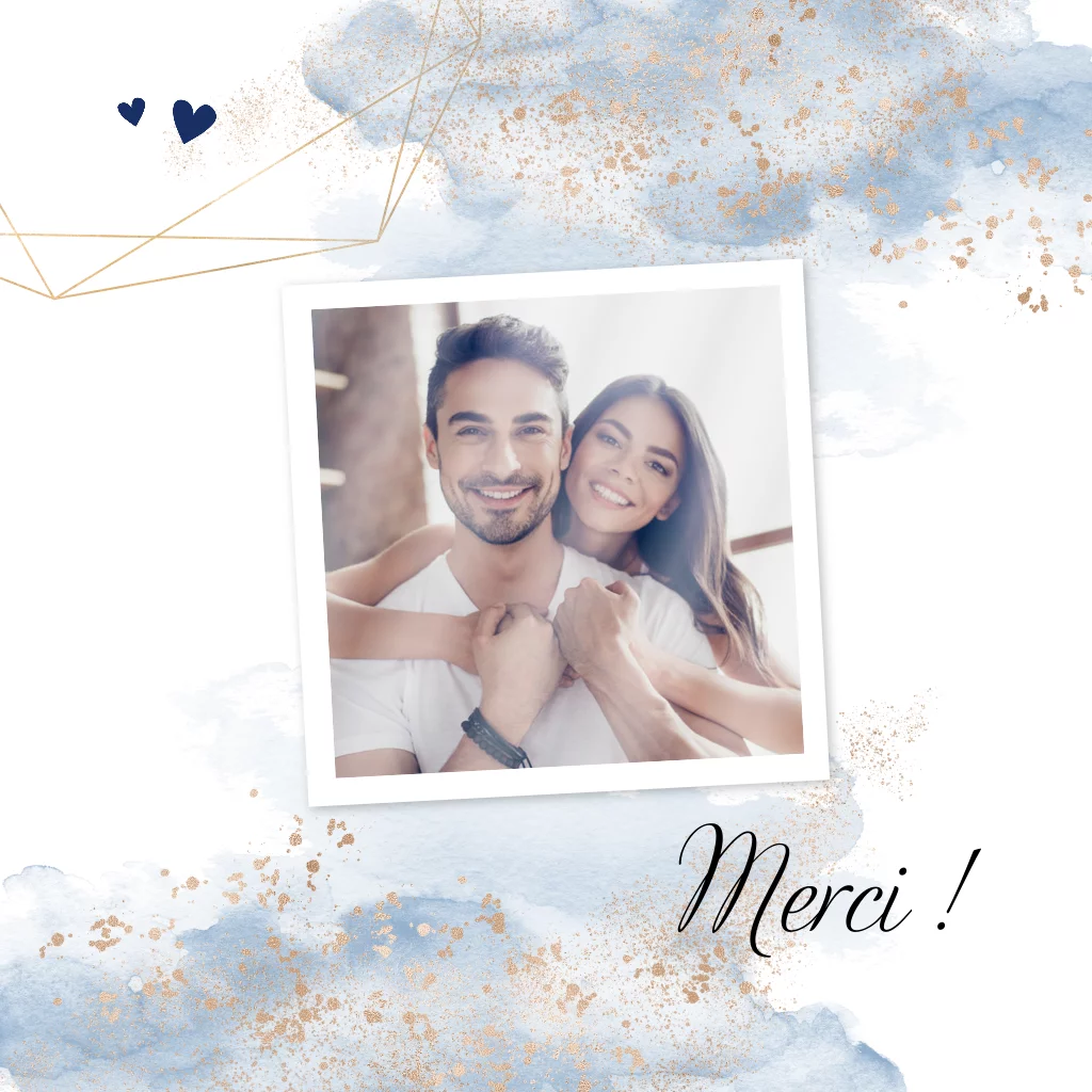 Carte de remerciement avec motif géométrique et aquarelle bleue.