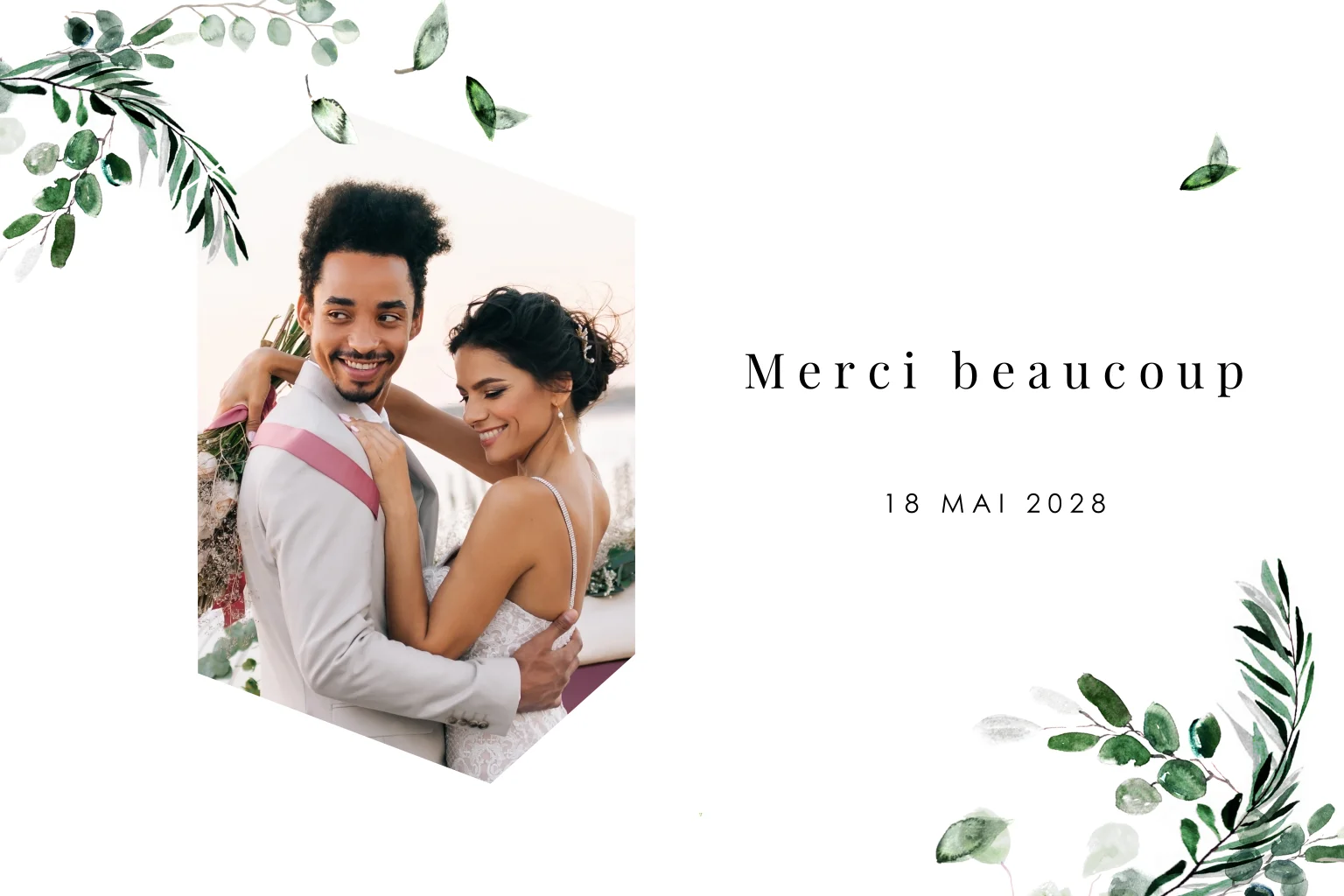 Carte de remerciement avec photo, branches et feuilles