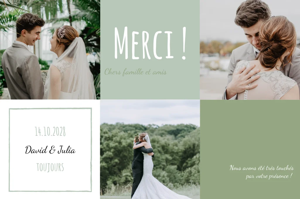 Magnet remerciement mariage moderne avec trois photos et détails verts