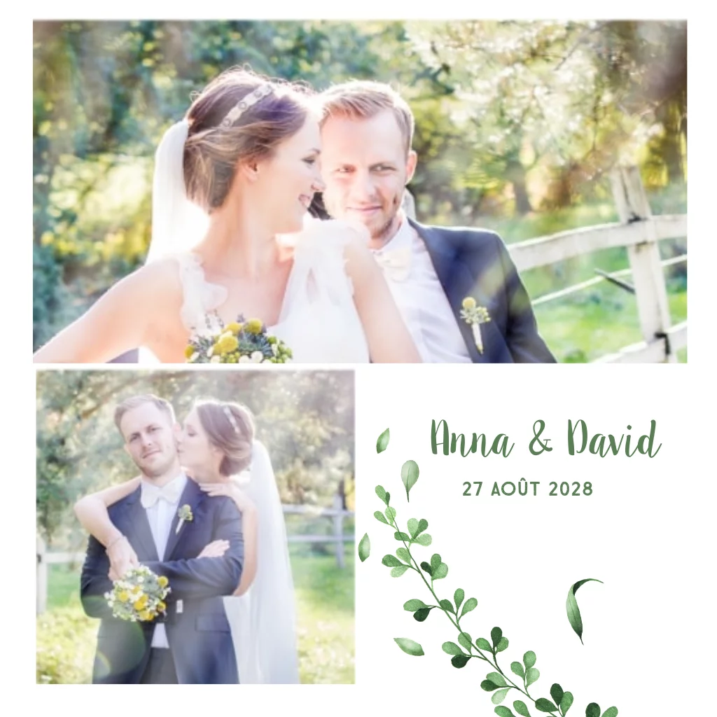 Il est agréable de surprendre les invités de votre mariage avec des souvenirs de votre journée grâce à une carte de remerciement avec vos propres photos ! Cette carte élégante est embellie d'une branche verte qui lui donne quelque chose de spécial.