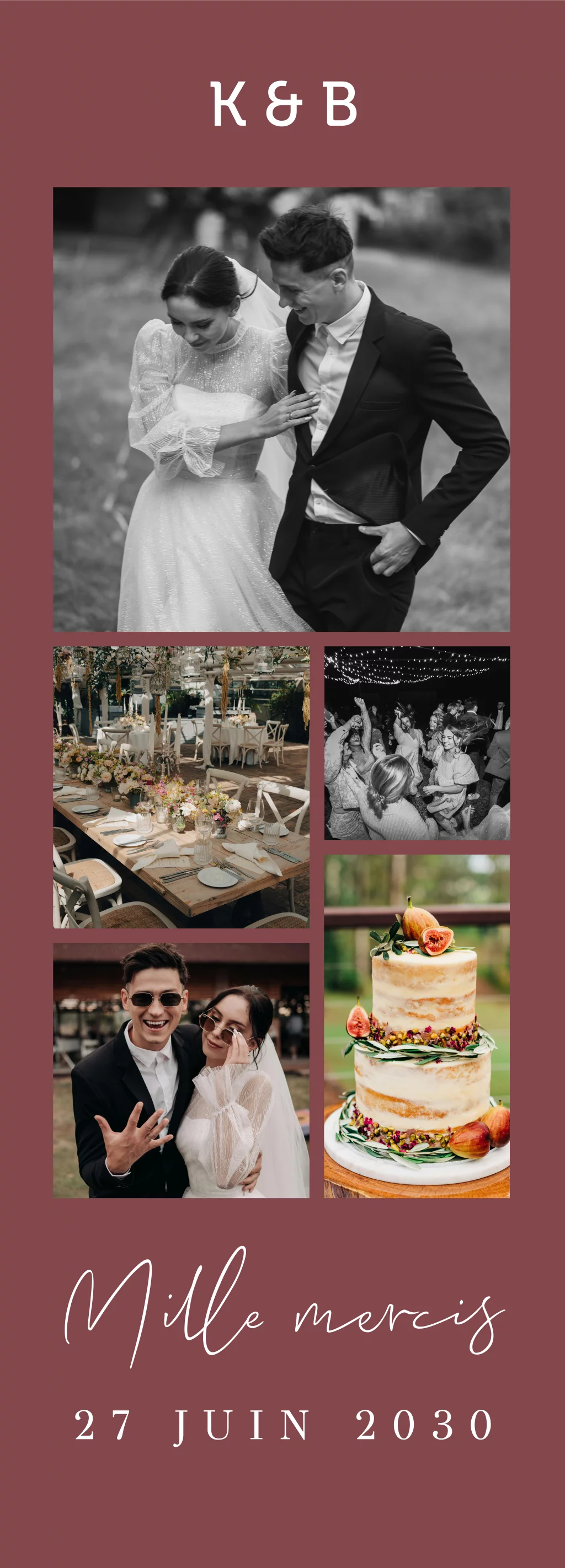 Marque-page remerciement magnet avec cinq photos sur fond rose foncé
