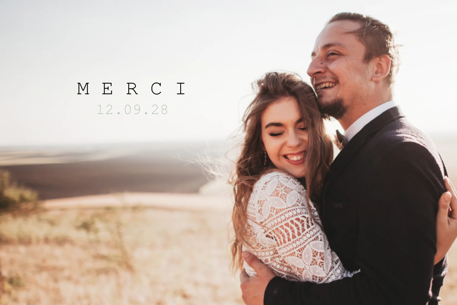 Carte de remerciement de mariage moderne avec photo et fleurs.