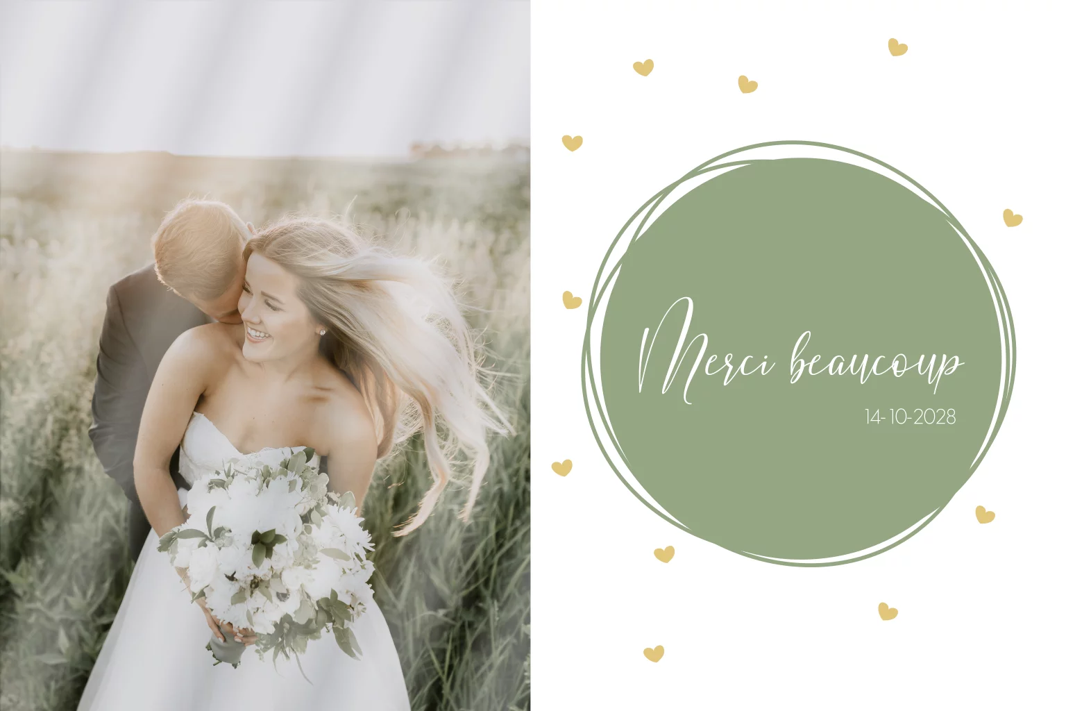 Carte de remerciement romantique pour vos invités de mariage avec de doux cœurs dorés et des détails verts. Placez une magnifique photo de votre cérémonie à l'avant et rédigez votre propre texte - vous envoyez ainsi un remerciement très personnel à vos invités avec cette carte !