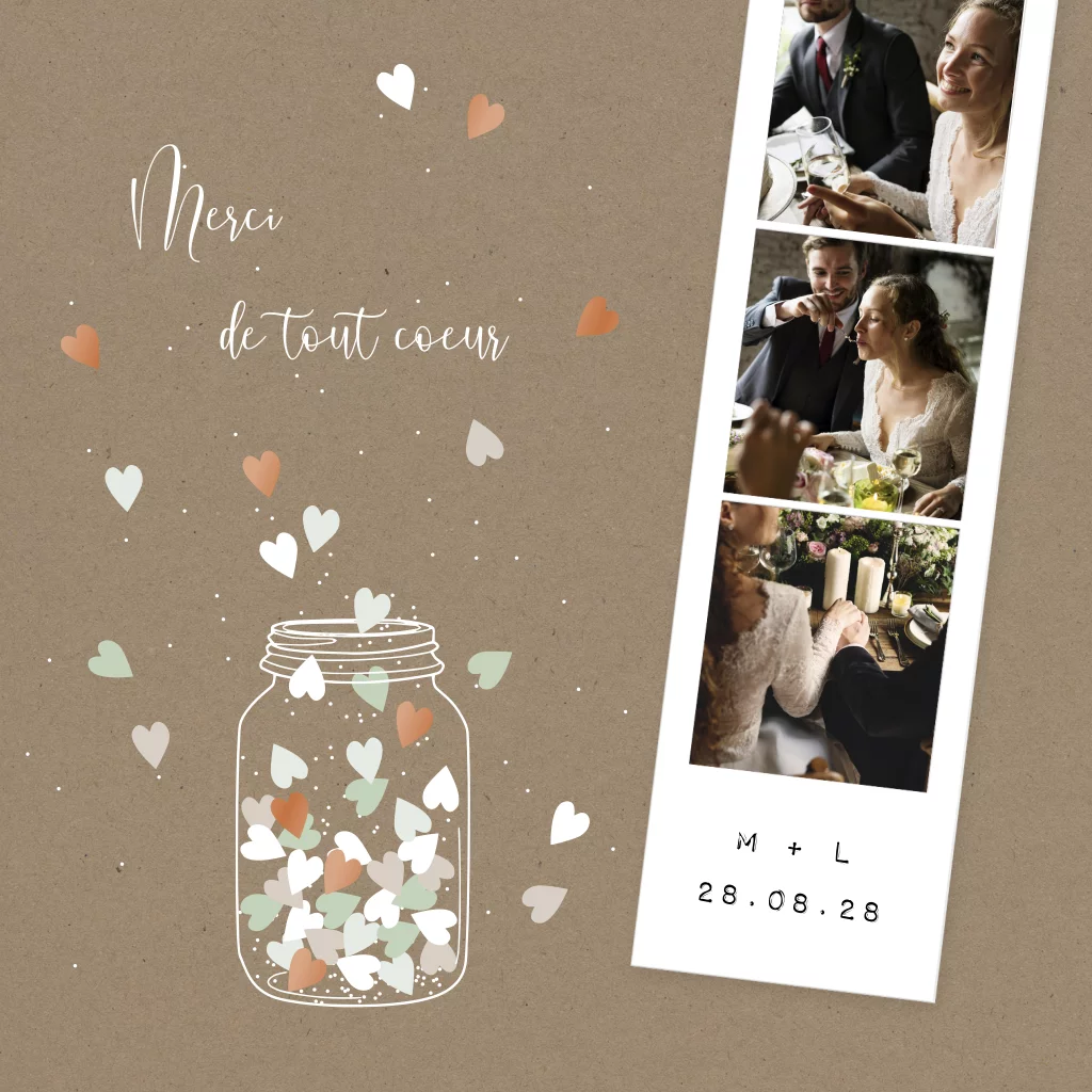Cartes de remerciement avec photos et une envolée de coeurs.