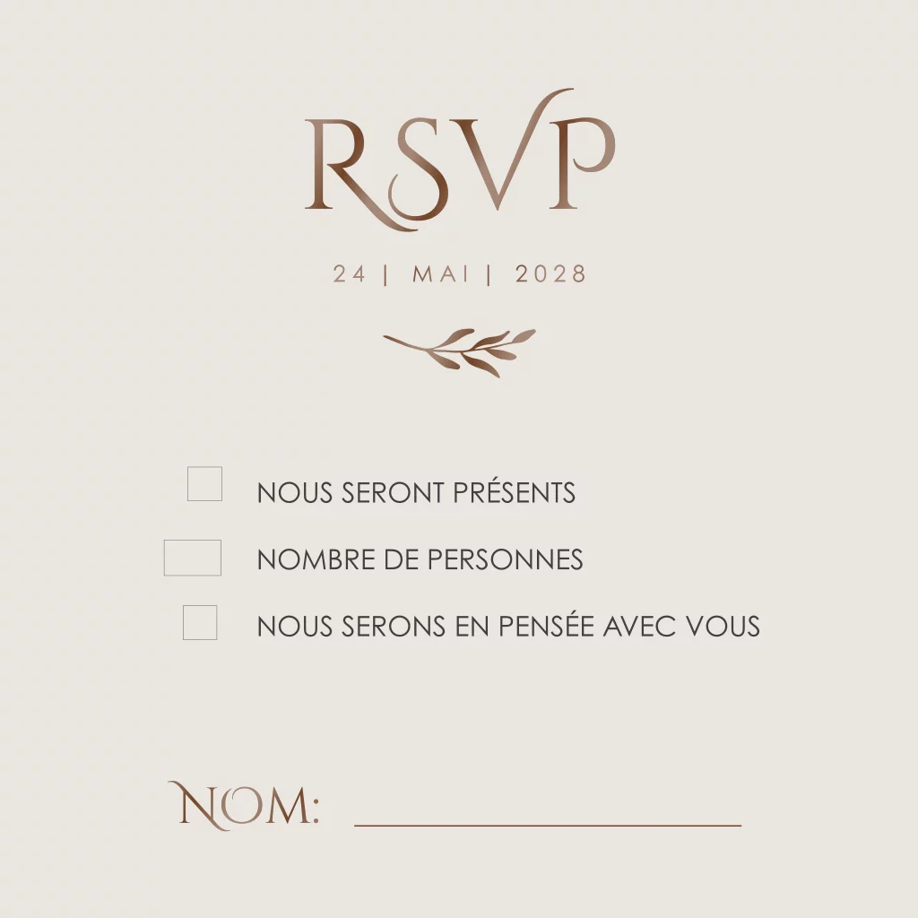 Carton réponse avec RSVP en vernis marron sur fond beige