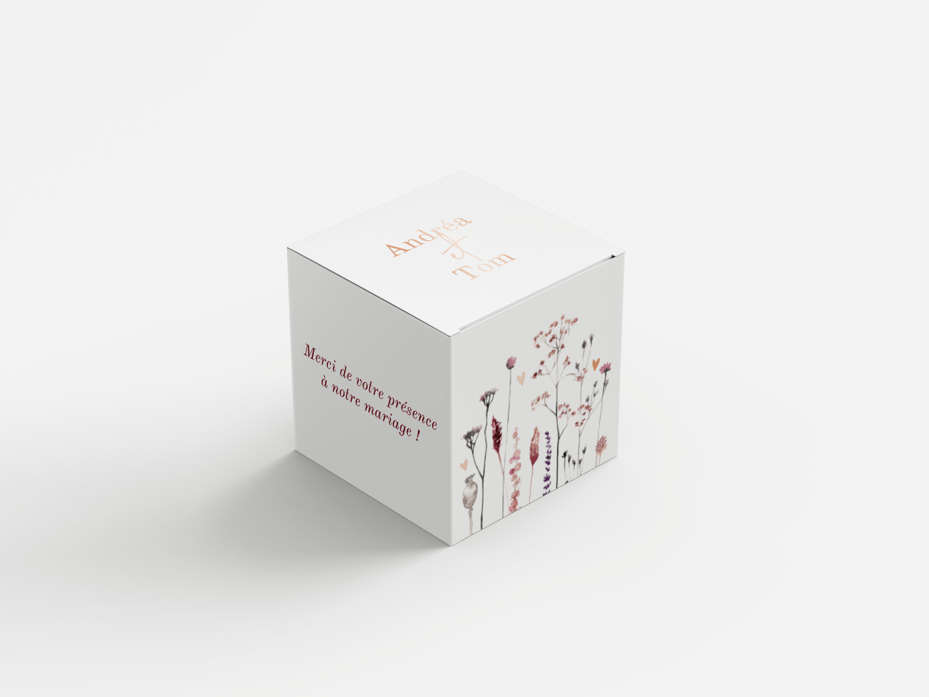 La boîte, avec des dimensions de 5 cm de chaque côté, est livrée dépliée. Le délai de livraison est de 4 jours ouvrables.
