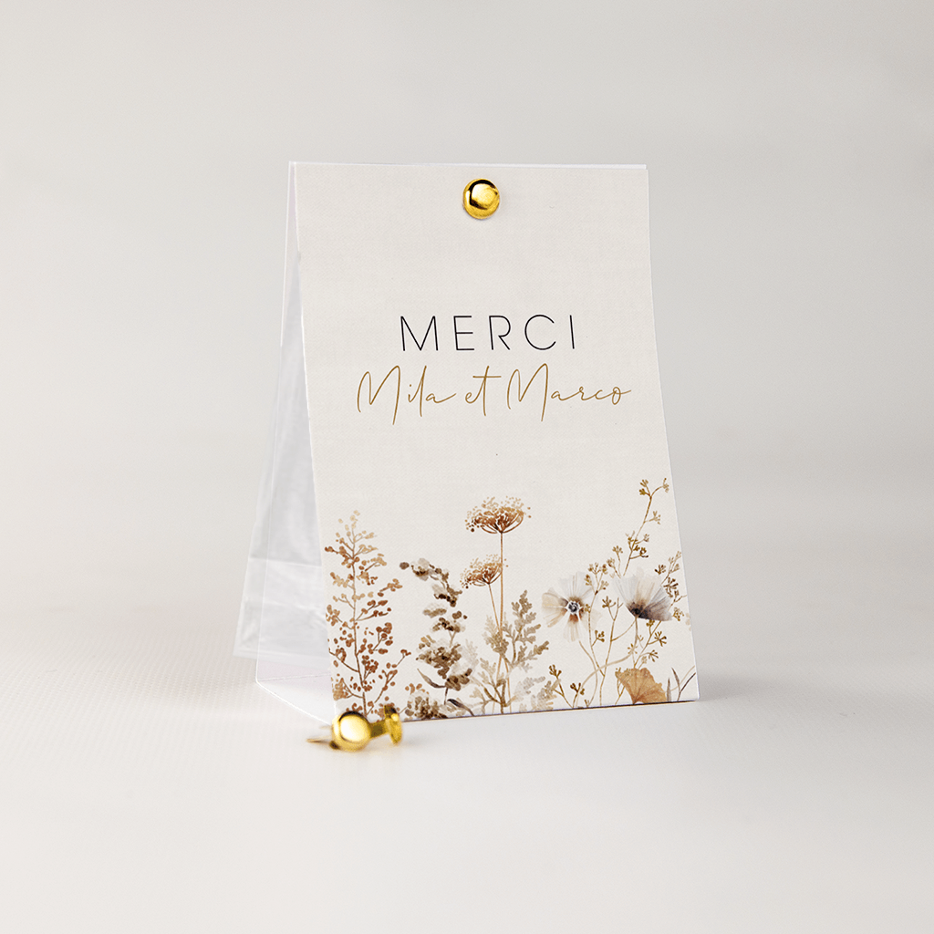 • Les deux faces peuvent être fermées à l'aide d'une attache parisienne et la boîte à dragées peut être complétée d'un sachet transparent pour les dragées.