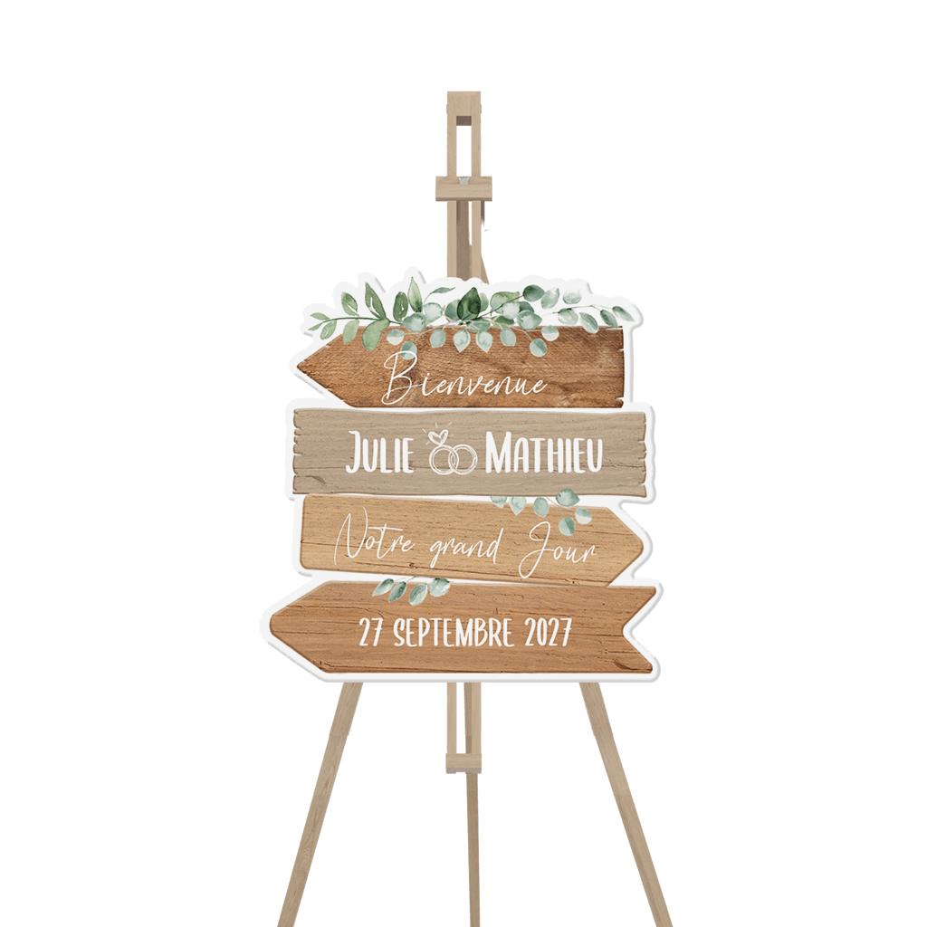 Panneau de bienvenu avec des branches d'eucalyptus sur impression bois.