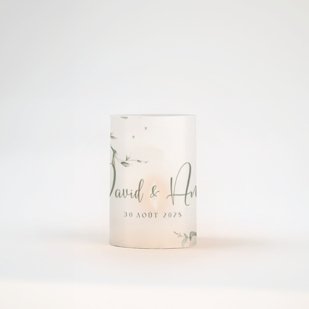 Photophore avec feuilles d'eucalyptus et typographie verte