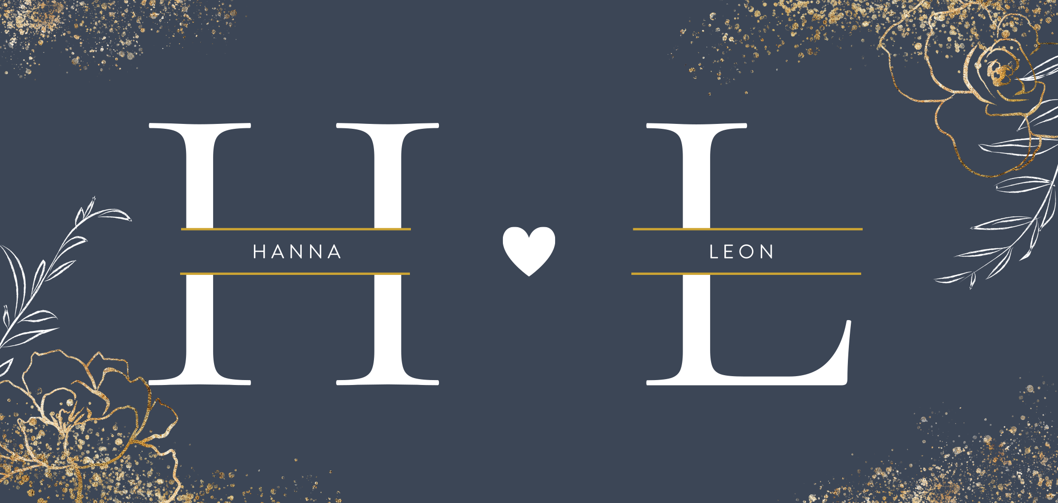 Faire-part bleu avec initiales des mariés et fleurs dorées