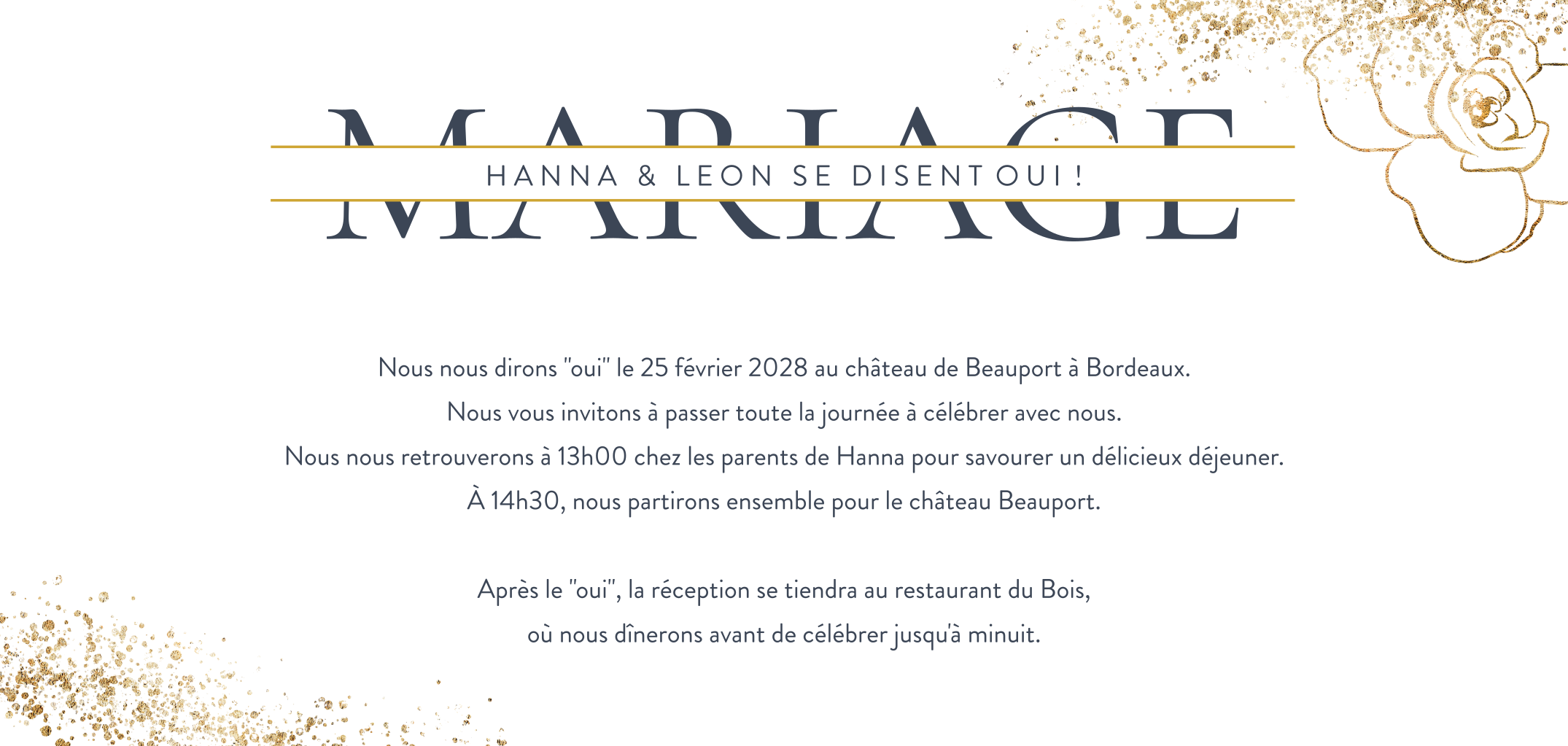 Faire-part bleu avec initiales des mariés et fleurs dorées.