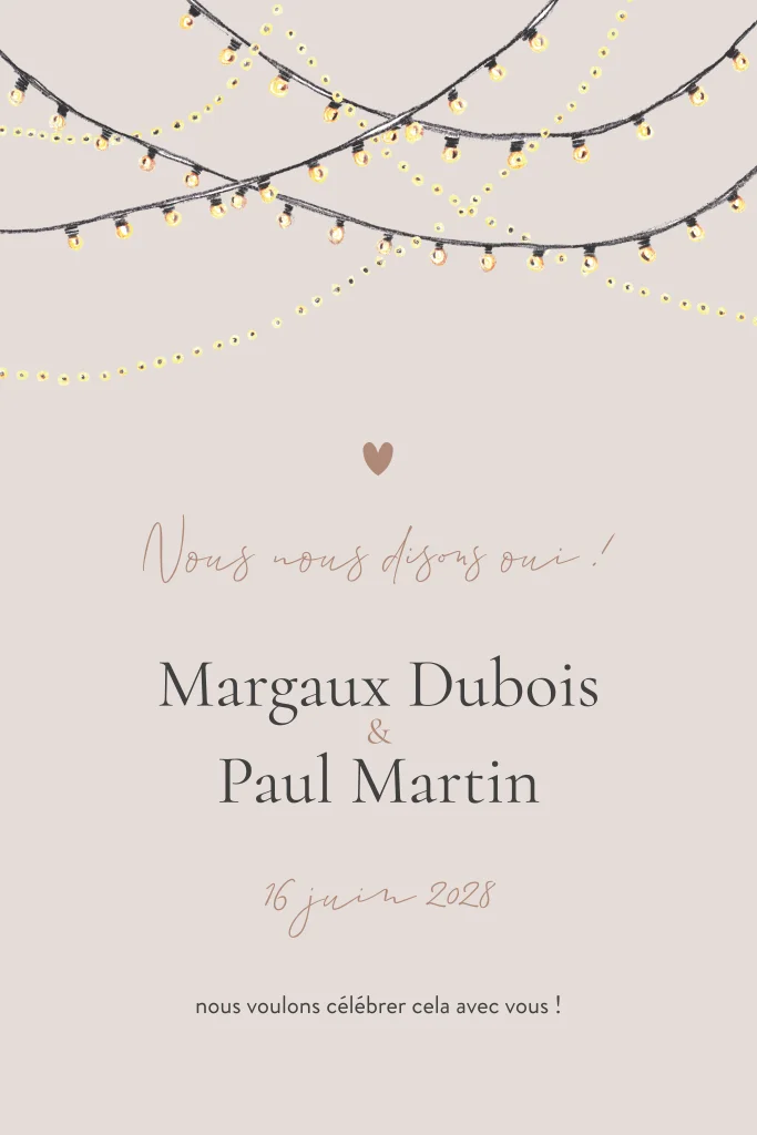 Faire-part de mariage beige avec guirlandes lumineuses à l'aquarelle