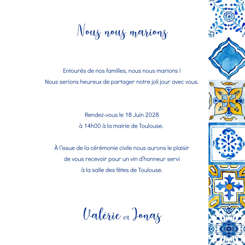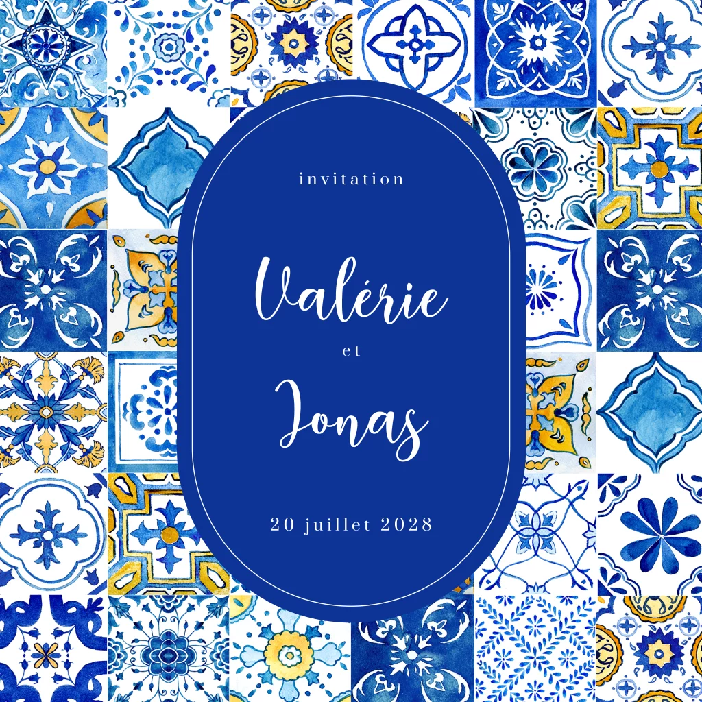 Faire-part de mariage bleu avec des tuiles portugaises en aquarelle.