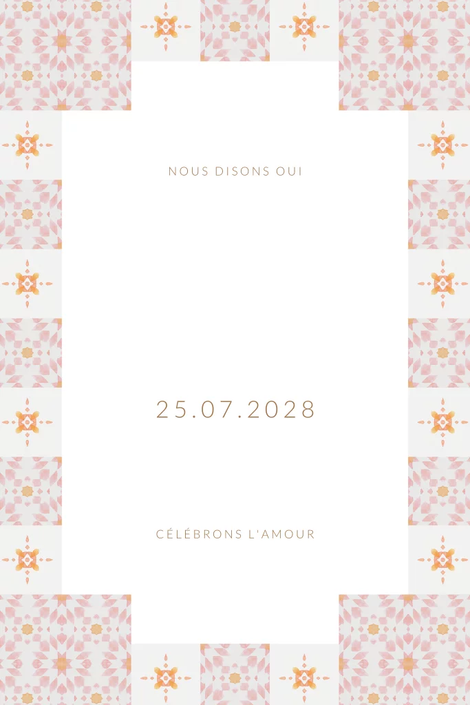 Faire-part de mariage avec design méditerranéen en rose, orange et or.