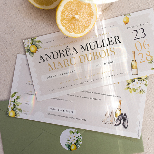 Faire-part de mariage en ticket d'invitation avec citronniers