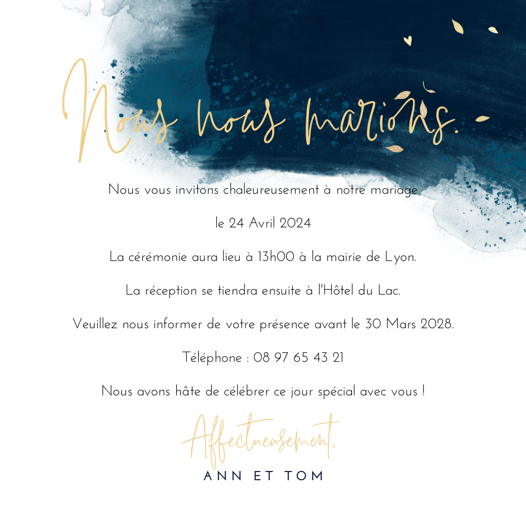 Faire-part de mariage avec feuilles dorées et traits de pinceau bleu nuit